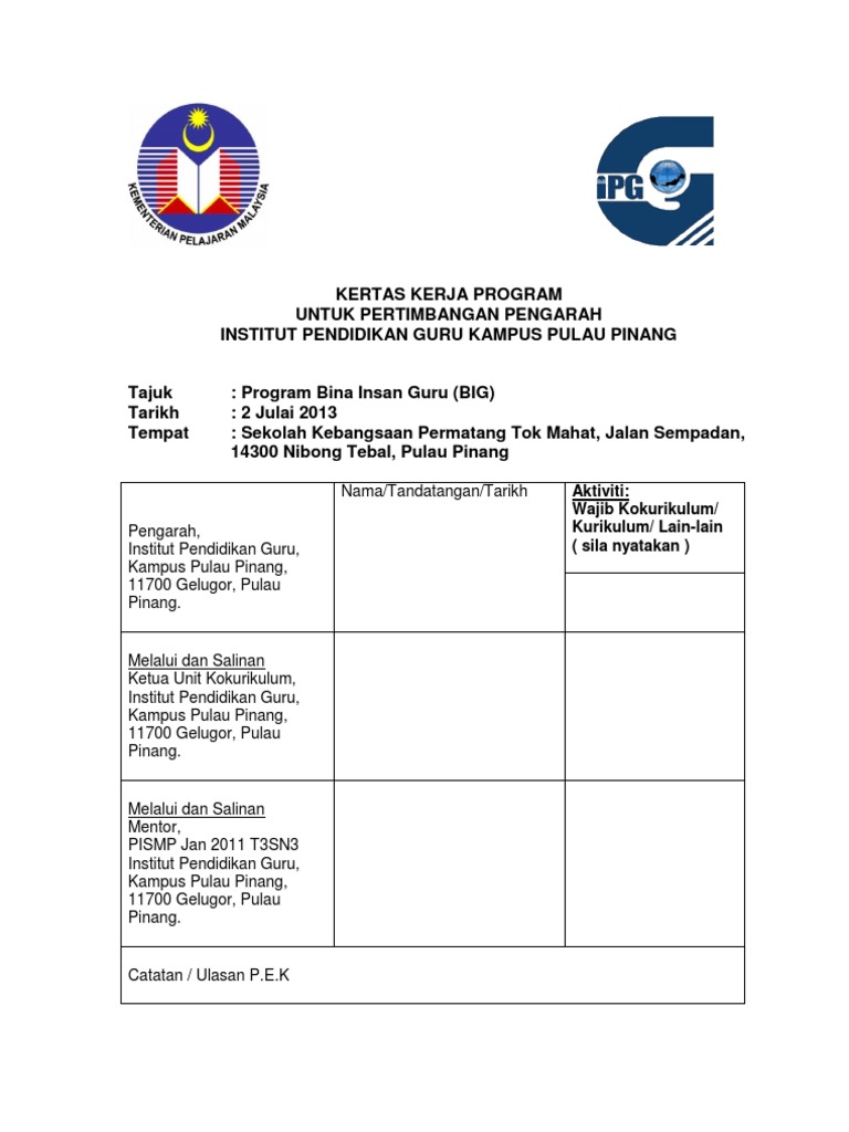 Surat Jemputan Vip Docx from imgv2-1-f.scribdassets.com Dalam persediaan saya untuk menjadi seorang guru mestilah memantapkan diri dengan segala ilmu di dada supaya kelak dapat menyesuaikan diri di sekolah sebagai seorang cikgu. Institut kemahiran belia negara bukit mertajam, pulau pinang. Search for university and college in malaysia. Institut pendidikan guru malaysia kampus pulau pinang (dahulunya dikenali sebagai institut perguruan persekutuan pulau pinang, i4p) ialah sebuah institut perguruan yang terletak di bukit chombee, pulau pinang. Jūs atėjote į šį puslapį, nes ji yra labiausiai tikėtina, ieško: Get available institute nearby you. Jabatan pendidikan jasmani dan kesihatan (kj). Jurnal akademia institut pendidikan guru kampus pulau pinang.